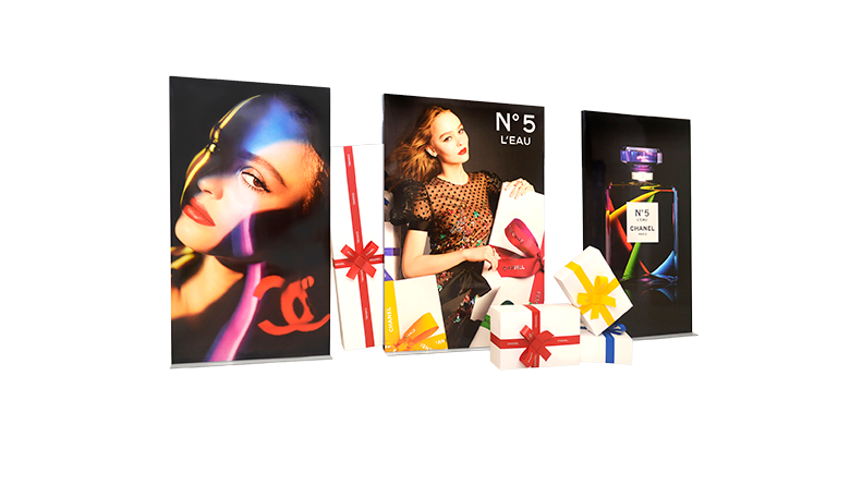 Made up of three large panels in rigid wrapped cardboard, this display showcases three iconic elements of the CHANEL world: the portrait of a model embodying contemporary elegance, the N°5 L’EAU perfume bottle, and a graphic composition of the signature double C in a play of colored shadows. High-definition printing ensures perfect image quality and a premium visual finish. Complementing the panels, cardboard gift boxes adorned with ribbons in various hues bring volume, depth, and vibrancy to the scene. The controlled layering of elements creates a dynamic composition that draws the eye while maintaining the chic minimalism true to CHANEL’s identity. The entire setup is designed for easy installation and transport, while offering optimal durability for the duration of the campaign.