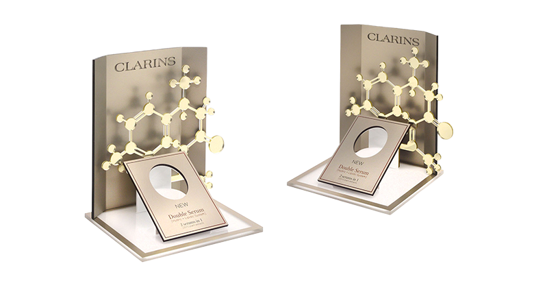 A concentrate of elegance and innovation to showcase an iconic product. This counter display for CLARINS Double Serum combines premium finishes with immersive design. It highlights the brand’s scientific expertise while capturing attention at the point of sale.