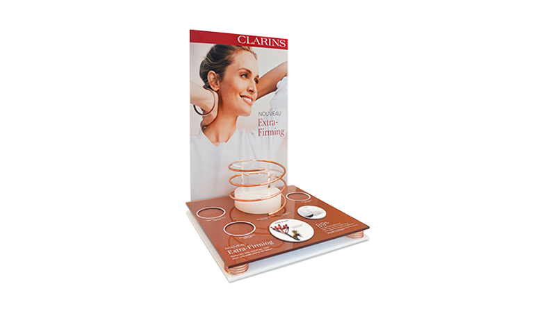Resting on a high-quality transparent acrylic base, this display features a three-tier circular system designed as a cascade to present the variety of formats in the Extra-Firming range. The ensemble plays with a harmony of warm tones—copper, rose gold, and Clarins’ signature red—evoking both sophistication and efficacy. Each tier is precision-cut to fit the containers perfectly, ensuring stability and optimal visibility. The rear cardboard backdrop, printed in high-definition, features a clean, natural lifestyle visual topped with the “NEW Extra-Firming” message, underlining the product’s novelty and innovation. The result is an immersive, impactful presentation perfectly aligned with Clarins’ visual universe.