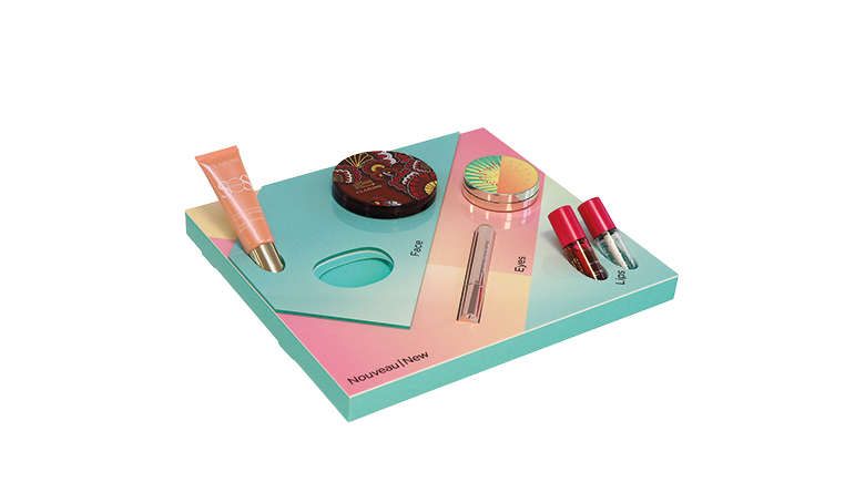 Crafted from rigid printed cardboard and crystal-clear PMMA, this counter display was designed to highlight the CLARINS makeup universe at point of sale. The cardboard base is structured on multiple levels, playing with elevation to create a sense of depth. Diagonal printed lines in soft pastel tones add energy and visual harmony, evoking the brand’s modernity and refinement.