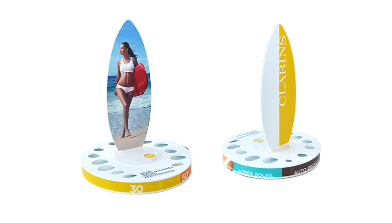 The vertical back panel is cut in the shape of a surfboard, reinforcing the holiday and seaside theme. A laminated printed graphic is applied to the panel, ensuring visual appeal and long-term resistance. The entire display instantly evokes summer, while staying true to the premium codes of the CLARINS brand.
