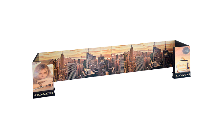 Crafted from matte black acrylic, this horizontal display offers a sleek and elegant base designed to showcase the brand’s iconic bottles. The back panel features a panoramic screen print of Manhattan, rendered in golden copper tones for a luminous and hypnotic effect. The Empire State Building and other emblematic skyscrapers are repeated as a motif, evoking both grandeur and urban sophistication. The lifestyle visual placed in the background reinforces the feminine and contemporary identity of the brand. The COACH logo, discreetly screen-printed in gold on the base, and the phrase « EXCLUSIVELY YOURS » on the right side, emphasize the exclusivity of the experience. The overall effect creates an immersive scenography reminiscent of the New York skyline, transforming the retail space into a prestigious showcase.