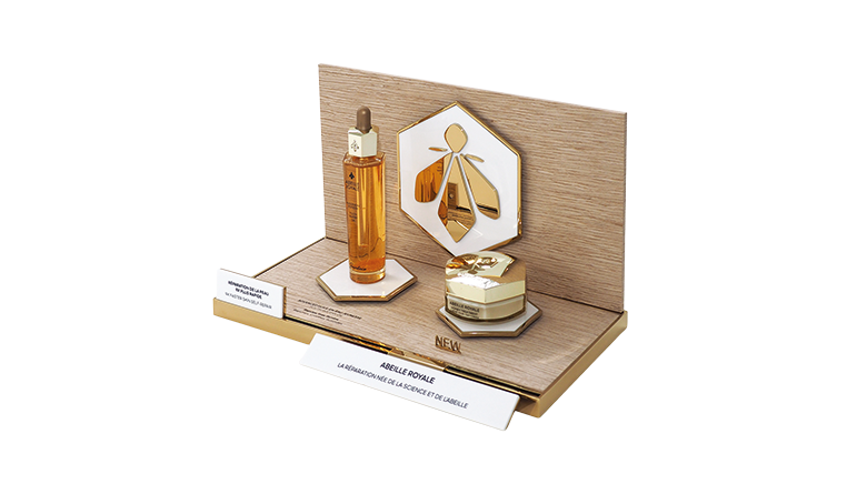 The base of the display is made of solid wood, bringing warmth and stability to the unit. It is encircled by a satin gold metal band that structures the volume while emphasizing the premium nature of the display. On this base, polished white PMMA stands elegantly support the products, creating a clean and refined presentation. The header, made of white PMMA, features a raised gold metal bee, the iconic signature of the Maison Guerlain. Small PMMA plaques placed near the bottles are screen-printed with descriptive labels that enhance the storytelling of the product. This display strikes the perfect balance between sophistication and clarity, highlighting every detail of this iconic skincare line.