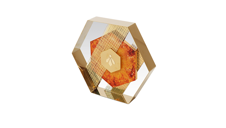 The metal structure is laser-cut then treated with mirror gold PVD finish for superior durability and shine. The PMMA block is machined and printed in high-definition quadri to reproduce the honey visual effect. The bee is made of injected metal and metallized by electroplating. Elements are manually assembled to ensure perfect precision and aesthetic coherence for each piece.