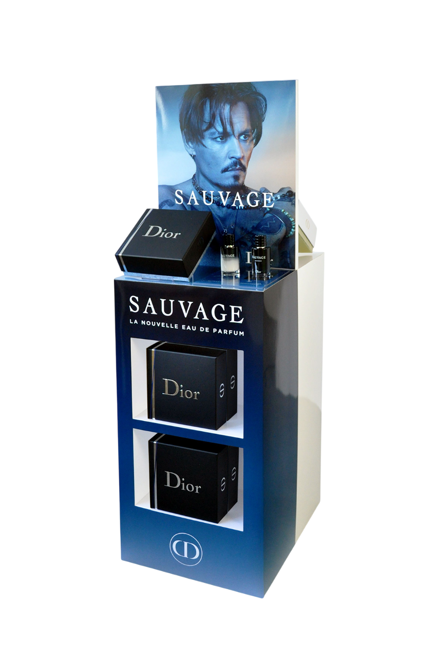 The Dior Eau Sauvage column is made of rigid cardboard and printed in high-definition quadri. At the top, the header showcases the iconic visual of brand ambassador Johnny Depp, immediately reinforcing the brand’s impact at point of sale. The top of the column is designed as a tester shelf, holding bottles for free fragrance trials. At the bottom, two integrated storage niches display products ready for purchase, facilitating the conversion act. The “CD” logo and the baseline La nouvelle eau de parfum are visible on the front, elegantly and clearly asserting Dior’s identity. This column thus combines promotion, sensory experience, and direct sales logic in a compact and efficient format.