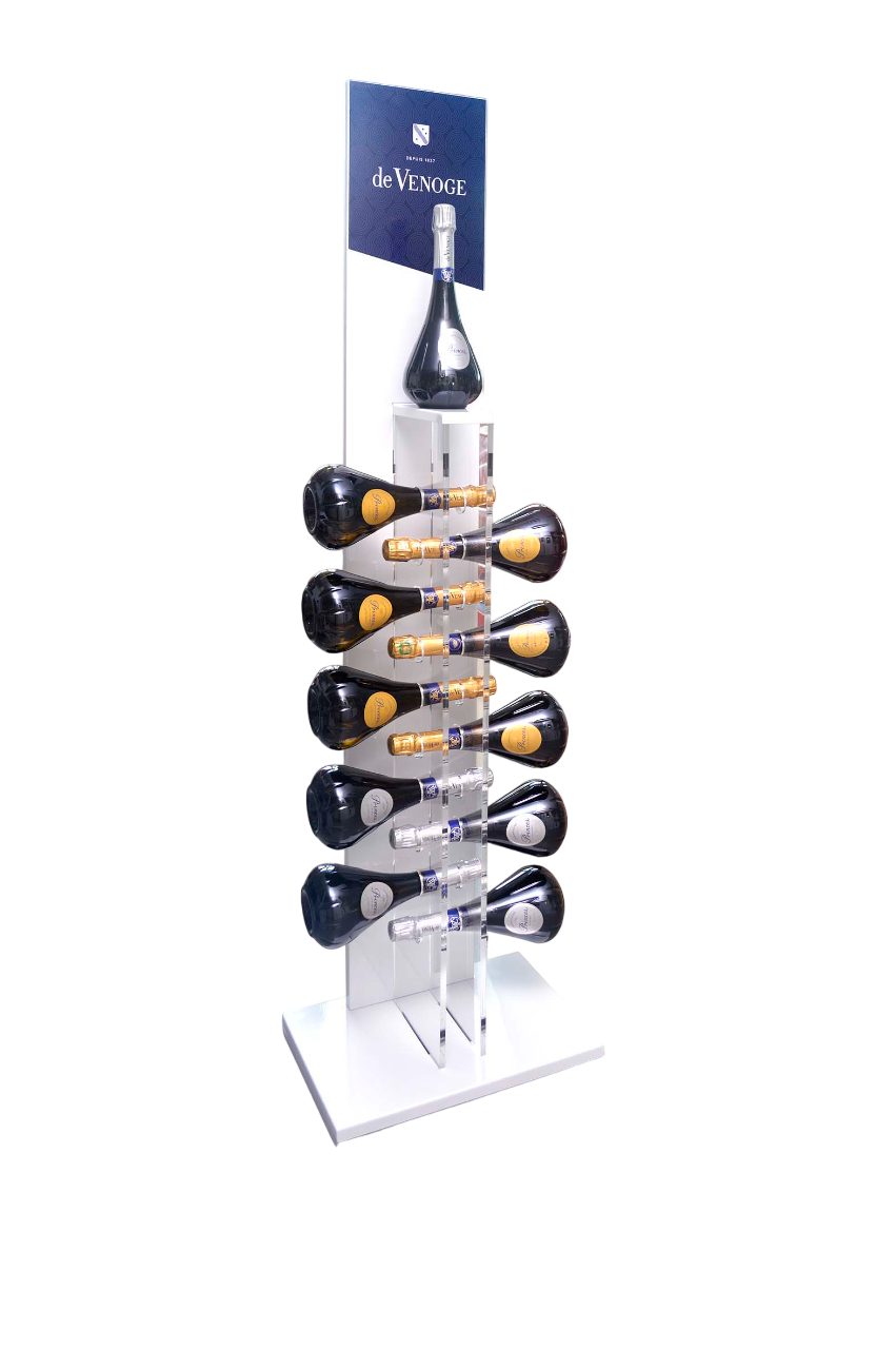 Crafted from white lacquered laminated wood, this floor display features a clean, luminous structure with excellent stability. Its vertical design highlights the champagne bottle range with an offset, staggered arrangement using transparent PMMA holders. This use of clear supports creates a floating effect, giving the presentation a sense of lightness and visual intrigue. A deep blue back panel displays the de Venoge logo, ensuring instant brand recognition. The lacquered white wood base completes the display with durability and polish. Striking yet discreet, the unit delivers a dynamic and premium showcase without overwhelming the retail environment.