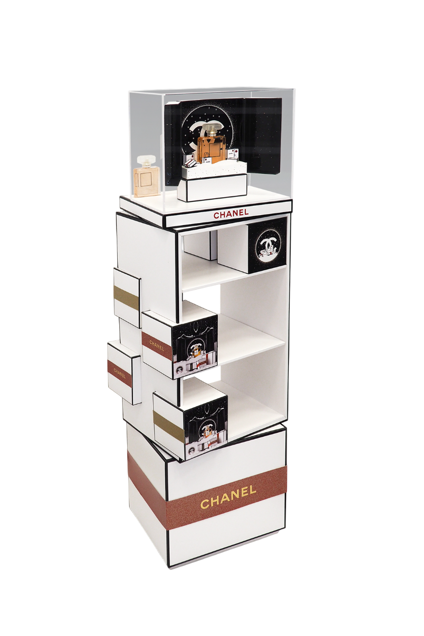 Crafted from premium cardboard, this column display adopts CHANEL’s iconic graphic codes: a structured white base accentuated by crisp black edging that echoes the Maison’s couture spirit. The top section features the hero product—a fragrance—placed on a sleek and understated plinth, surrounded by sophisticated holiday-themed visuals. On the front, the CHANEL logo appears in gold hot-stamping or metallic silkscreen, adding a luminous, luxurious touch. Elegant printed illustrations of gift boxes or signature bottles enhance the side panels, creating a discreet yet festive ambiance. The result is a POS solution that is both aesthetic and functional, fully aligned with the brand’s refined identity.