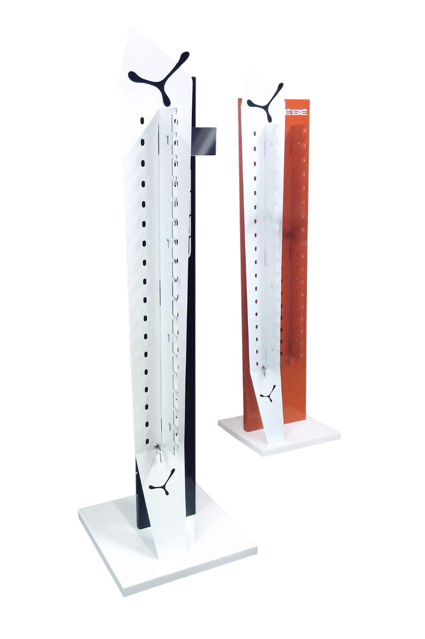 Crafted entirely from painted metal, this floor display combines structural strength with a sleek, contemporary look. Its wide base ensures maximum stability, even in high-traffic areas. Two forward-inclined vertical panels create a strong visual flow while enhancing customer reach and product visibility. The contrast between crisp white and bold orange evokes the energetic world of sports and outdoor gear. Integrated PMMA slots on the front allow for interchangeable hooks or brackets, enabling flexible product presentation. At the top, a laser-cut logo backed with black detailing adds a bold branding statement, inspired by the clean lines and high-tech codes of performance brands.