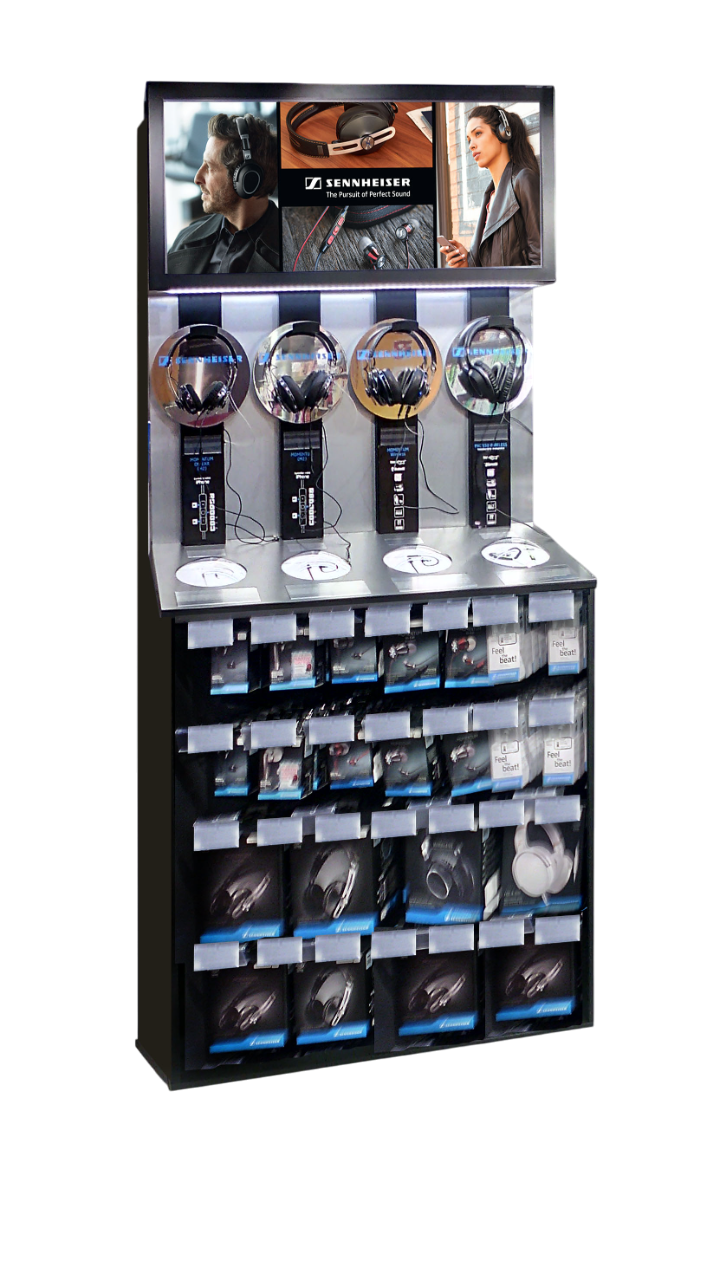 The Sennheiser display is conceived as an immersive space dedicated to product demonstration. Its matte black metal structure commands an elegant and professional presence. The top banner features lifestyle visuals rooted in the brand’s professional universe, reinforcing its expert audio positioning. The central area includes four interactive listening stations, each equipped with headphones suspended on circular backlit supports. Each station features a digital control panel allowing comparison of multiple models and sound settings. The lower section contains modular compartments organizing stock in a sleek, graphic style reminiscent of a technical library. The Sennheiser logo and the signature “The Pursuit of Perfect Sound” are screen printed in a subtle pattern on structural elements. Integrated LED lighting and anti-reflective finishes enhance the display’s premium and professional look.