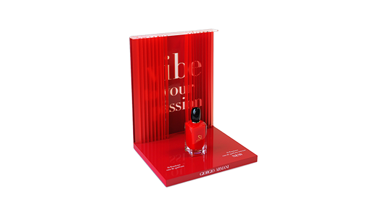 This glorifier, made from translucent red PMMA, is designed to reveal the full intensity of the Sì Passione fragrance. Its glossy base acts like a mirror that diffuses light, while the bottle is staged at the center like a precious jewel. The GIORGIO ARMANI logo, silkscreened in white on the front, ensures instant brand recognition. Two vertical side panels, composed of grooved PMMA slats, create a striking perspective effect: as the viewing angle shifts, the slogan “Vibe Your Passion” gradually appears. This subtle yet dynamic visual animation resembles a stage curtain opening to reveal the scene. The entire display plays with light, reflections, and shadows to amplify emotional impact at the point of sale.