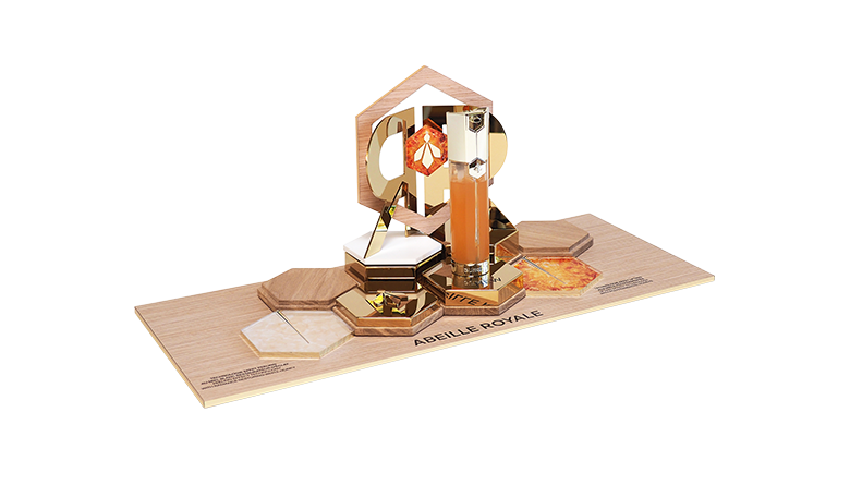 A blend of poetry and precision, this Guerlain display embodies the sensory world of Abeille Royale. A true objet d’art, it presents the products as honeycomb treasures. A setting that is both noble, technical, and rich in symbolism.