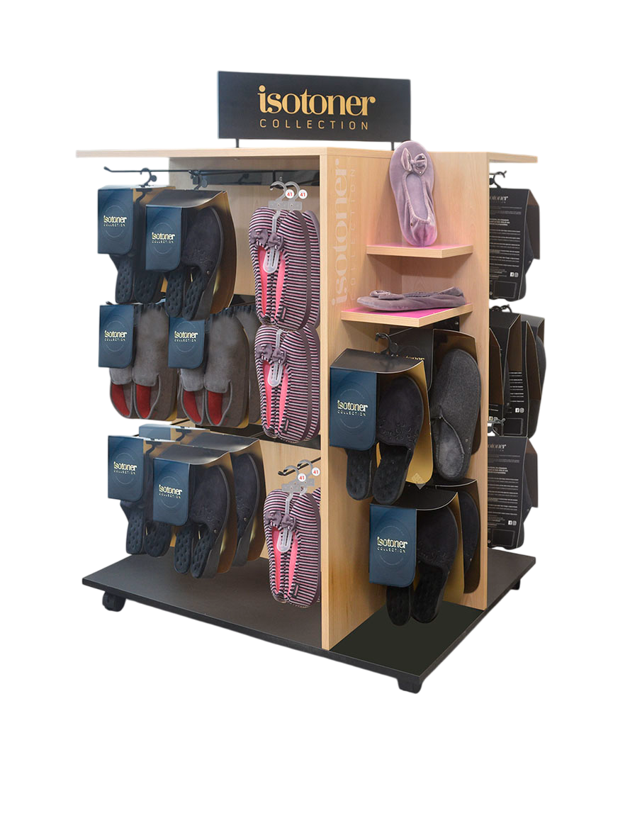 Designed to elevate the in-store presentation of ISOTONER’s slipper collection, this floor display combines strength with visual appeal. Its laminated wood construction follows a clean, contemporary design, perfectly aligned with the brand’s textile and wellness universe.
