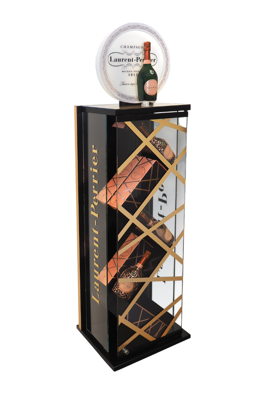 This presentation column pairs a metal casing with tempered glass side and front panels, offering an aesthetic that is both contemporary and premium. Gold stickers adorn the side glass with the Laurent-Perrier logo, while graphic bands on the front create a dynamic, structuring pattern. Bottles are stored and displayed staggered, producing a sense of depth and a modern visual rhythm. The backlit PMMA header, carefully screen printed, completes the ensemble by immediately drawing attention. Compact and impactful, this column is designed to showcase each bottle as a precious object while providing optimal storage capacity.