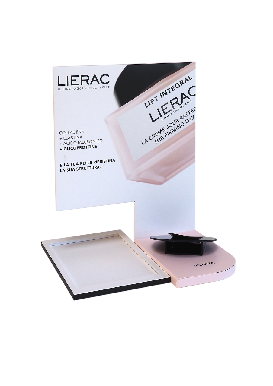 Designed to reflect the elegance of the Lift Intégral range, this cardboard display merges visual softness with dermatological precision. Powder pink and white tones, paired with a precisely screen-printed gradient, echo the product’s color codes while creating a harmonious and sophisticated effect. The structure highlights the hero product while ensuring strong visibility on-shelf. Technical inscriptions (“Collagen”, “Elastin”, “Hyaluronic Acid”, “Glycoproteins”) visually convey scientific efficacy, reinforcing the proof-based message. The slogan “Il Linguaggio della Pelle” printed on the visual nods to the brand’s Italian heritage and sensorial expertise. The LIERAC logo, screen-printed in black, adds a touch of understated luxury.
