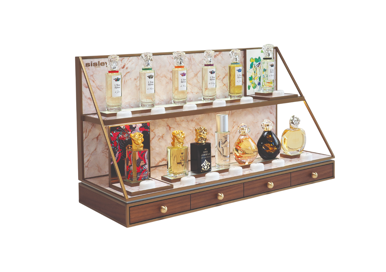 This premium counter display was designed to highlight the entire Sisley perfume range. It blends noble materials with refined design to offer a high-end sensory experience at retail. Ideal for attracting attention on counters or dedicated areas.