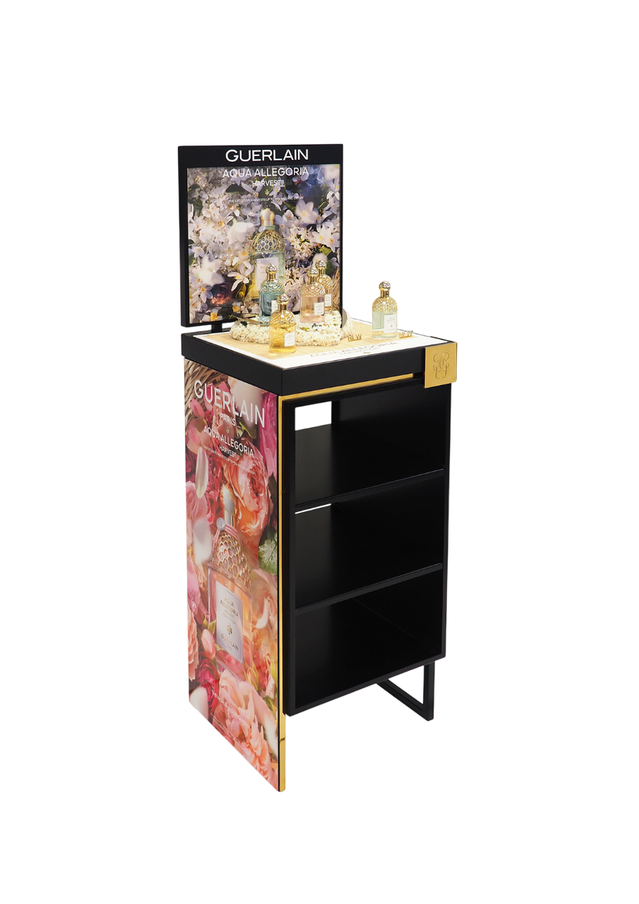 Made from black lacquered metal with an epoxy finish, this column display blends strength and aesthetics. Measuring 91 cm high by 43 cm wide and 44 cm deep, it fits seamlessly into retail environments while drawing attention. The header features a cut-out GUERLAIN logo in PMMA and a printed floral-toned visual evoking the Aqua Allegoria world. On the front panel, the brand name appears in golden PMMA, creating a premium signature. A colorful side visual enhances the structure and boosts visual impact in-store. The base is adorned with a heart-shaped floral decoration that displays the bottles in a poetic and evocative way. This unit blends storytelling, emotion, and material excellence to deliver exceptional product presentation.