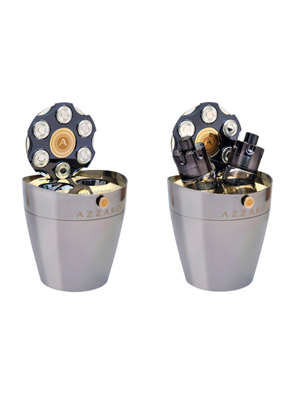 This counter display in bucket format is crafted entirely from metal, combining chrome and gold finishes for a high-impact result. The silver-toned base features a raised gold AZZARO logo, adding a premium touch. On the side, a metallic medallion engraved with the letter “A” reinforces the brand’s signature. The bucket’s interior bottom replicates the revolver barrel design—a direct reference to the iconic fragrance cap—with six stylized “chambers” in mirrored chrome finish that reflect the light brilliantly. The upper rim, finished in reflective gold, creates a captivating interplay of light even when the product is not displayed. The overall design conveys a powerful, bold masculine aesthetic.