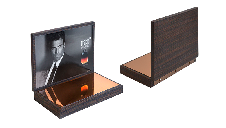 A glorifier of unapologetic refinement, designed to embody the timeless masculine elegance of the MONT-BLANC brand. The combination of natural wood and glossy gold makes it a visual support that is both discreet and impactful. An object of display serving an intense olfactory universe.