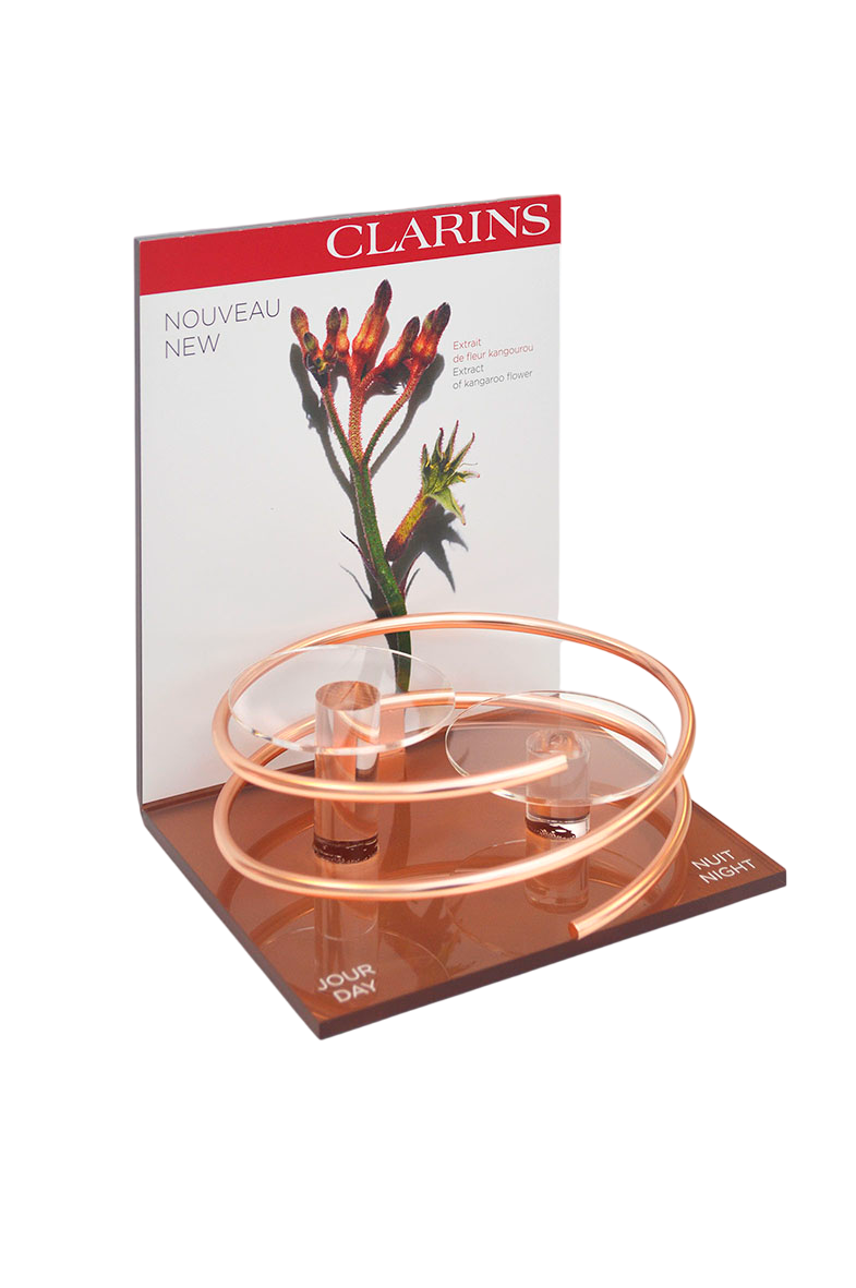 Combining high-end aesthetics with product storytelling, this shelf glorifier features a polished rose-copper PMMA base that emits a soft, warm glow, underscoring the precious nature of the Extra-Firming line. A deep red PMMA backdrop displays a clean white silkscreened CLARINS logo. Behind it, a high-definition print of the signature kangaroo flower reinforces the natural ingredient narrative. The circular spiral structure, also made of tinted PMMA, subtly symbolizes the passage of time and the continuity of care. The words “DAY” and “NIGHT,” delicately silkscreened on the spiral, guide the viewer’s eye toward the center, where the products are arranged. This immersive and fluid display transforms the shelf into a visually harmonious experience.