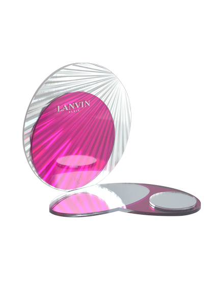 Created to enhance the presence of Éclat de Nuit by LANVIN at point of sale, this linear tester features a base crafted from polished PMMA, combining two finishes: soft pink and mirrored silver. A slightly elevated circular zone at the center elegantly positions the bottle, while the oval-shaped base reflects light for a dynamic visual effect. The circular back panel is engraved with a radiant pattern directly into the material, creating delicate light diffusion from every angle. At its center, a semi-transparent fuchsia plaque highlights the LANVIN Paris logo, silkscreened in silver lettering. The entire piece gracefully expresses the vibrant elegance of the fragrance.